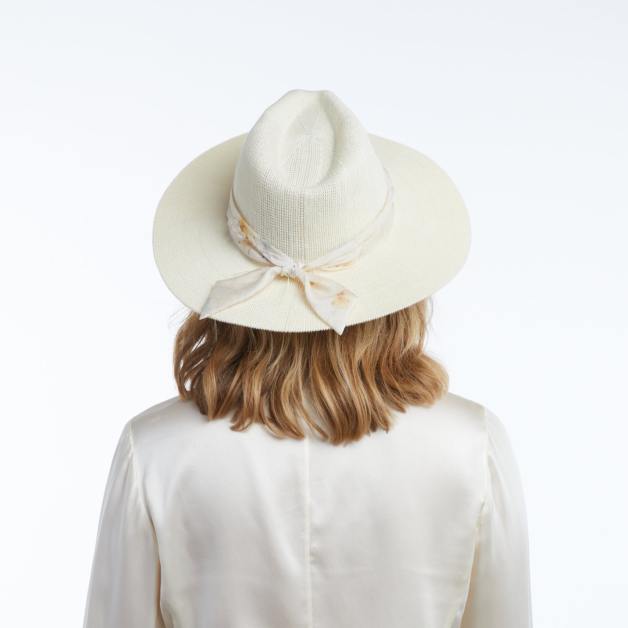 Our Corsica panama is trimmed with a floral print chiffon scarf and frosted beads on twine.