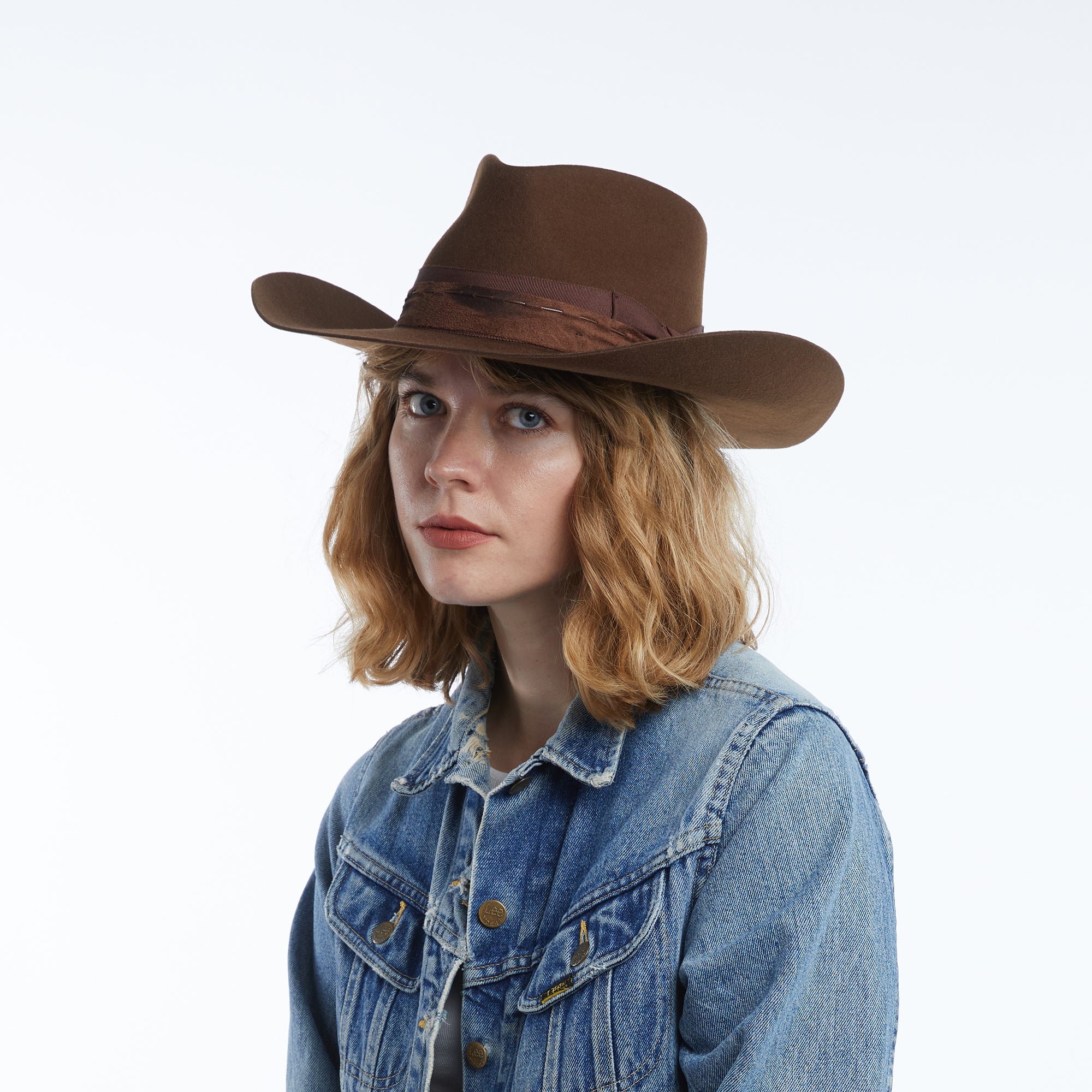 Structured silhouette, classic cowboy design, teardrop crown, upturned brim, contrast layered ribbon and feather detail, vintage effect. Made from Australian wool felt.